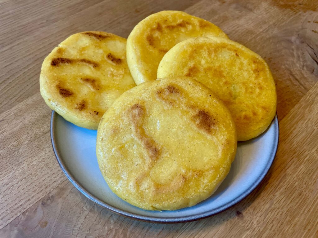 Arepas sind in Kolumbien allgegenwärtig. Sie werden zum Frühstück mit Butter und Rührei gegessen, aber auch als Beilage zu Steak, mit geschmolzenem Käse gefüllt oder aufgeschnitten und mit Hühnchen und Guacamole belegt. Dabei sind Arepas super schnell gemacht und bestehen aus nur drei Zutaten.